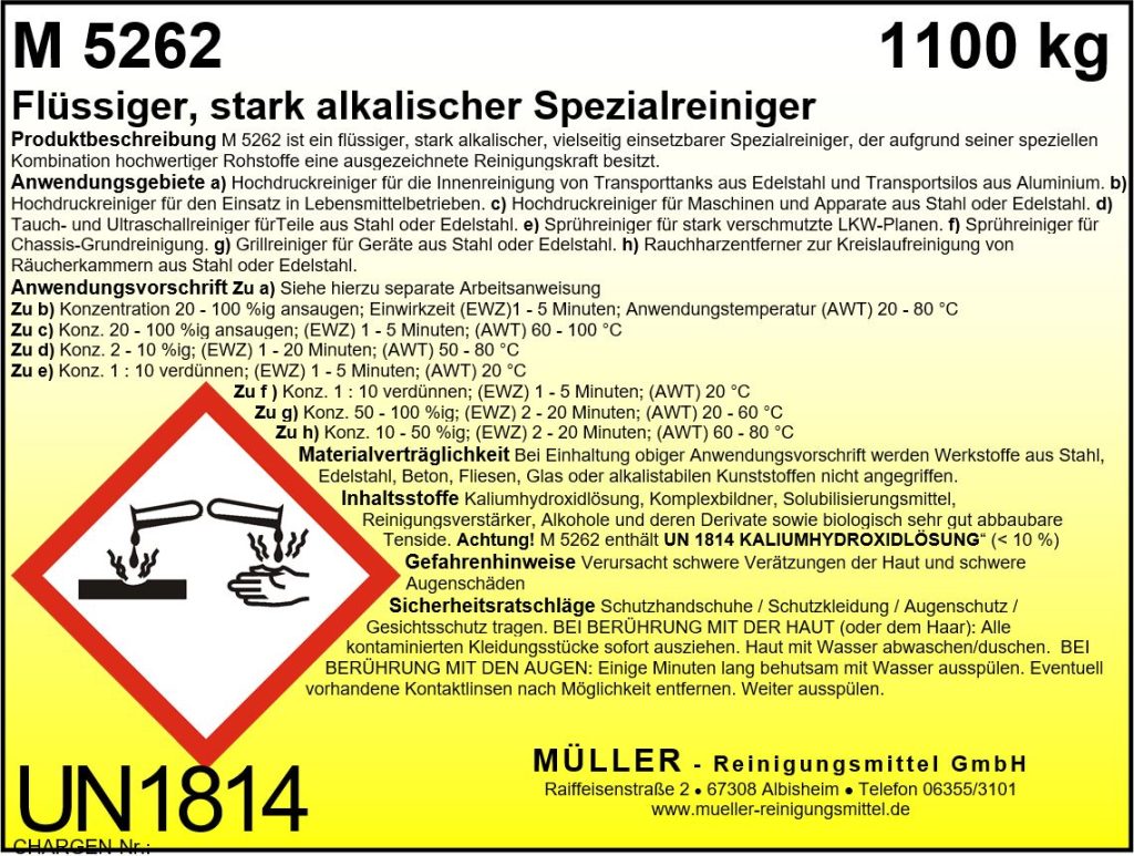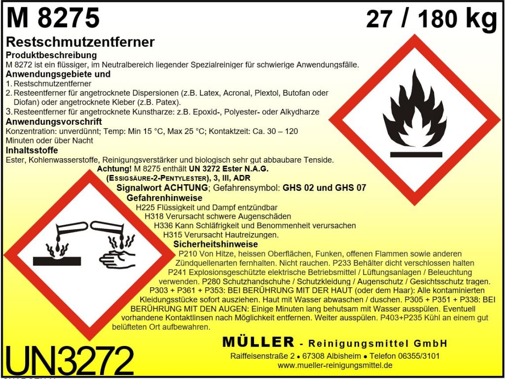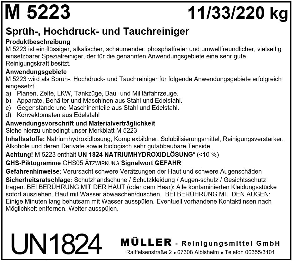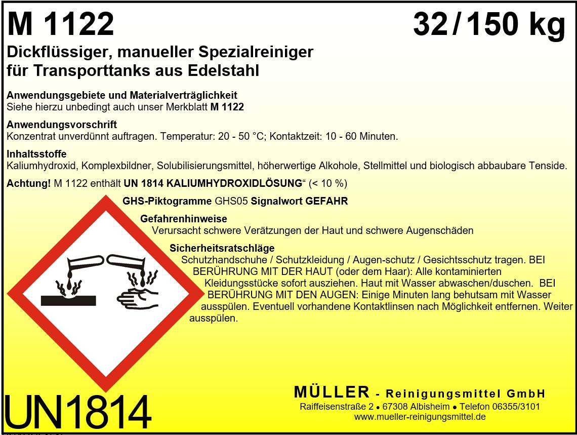 M 1122 ist garantiert frei von chlorierten und fluorierten Kohlenwasserstoffen. Er ist nicht als „mindergiftig“ oder „giftig“ zu kennzeichnen. Lediglich aufgrund des Gehaltes an Kaliumhydroxidlösung als Alkalitätsträger ist M 1122 als „ätzend“ zu deklarieren. M 1122 besitzt einen leichten, charakteristischen Geruch.