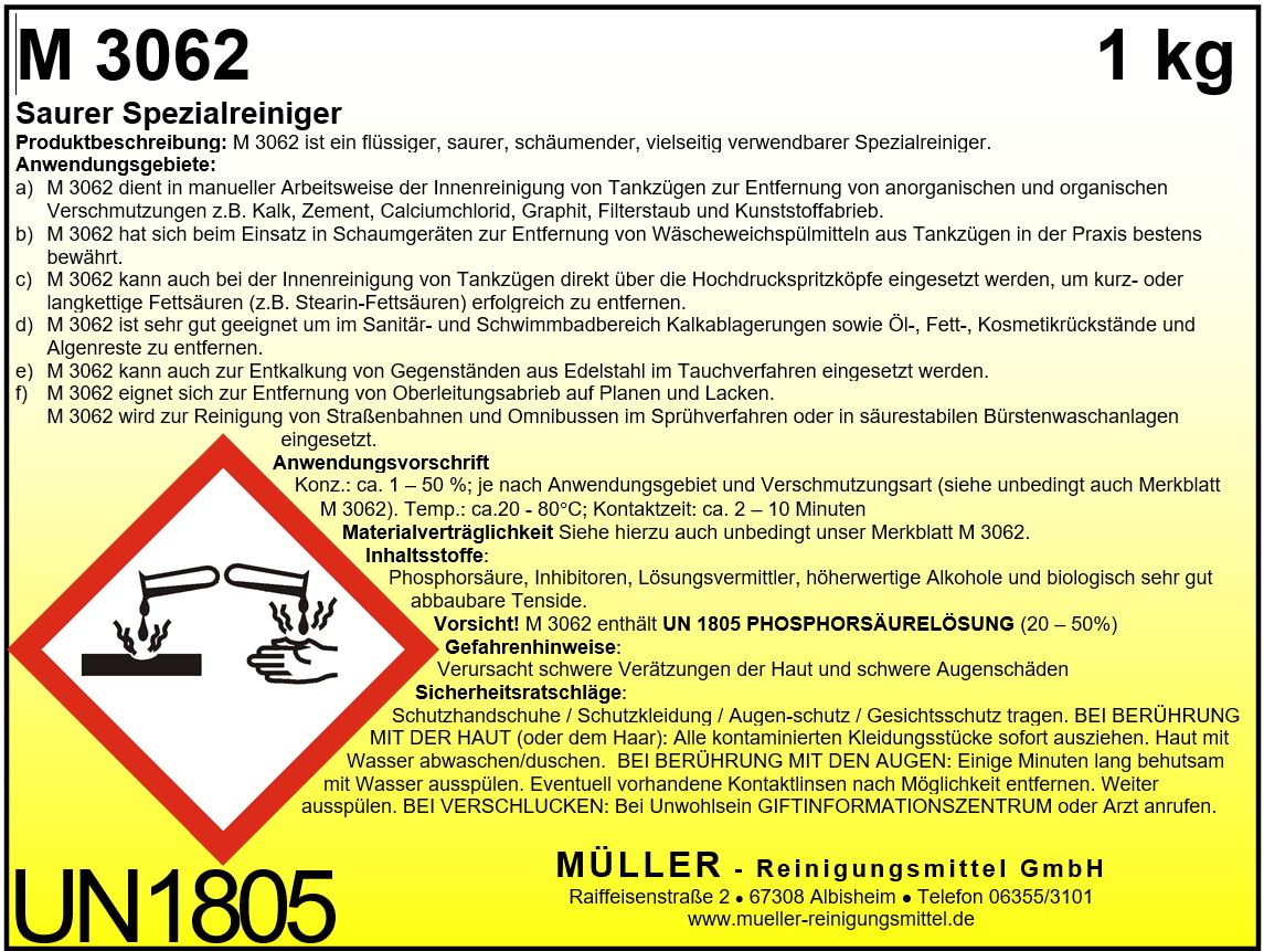 M 3062 ist ein flüssiger, saurer, schäumender, vielseitig verwendbarer Spezialreiniger auf Phosphorsäurebasis. Er enthält eine spezielle Kombination eines hohen Säuregehalts, kapillaraktiver Tenside und Solubilisierungsmittel, welche den Schmutz porentief unterwandern und materialschonend von der zu reinigenden Oberfläche ablösen. M 3062 kann überall dort eingesetzt werden, wo neutrale und alkalische Reinigungsmittel versagen.