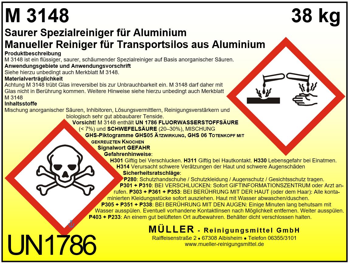 M 3148 ist ein flüssiger, stark saurer, schäumender Spezialreiniger, der speziell für die manuelle Reinigung von Aluminiumoberflächen entwickelt wurde. M 3148 besitzt aufgrund einer ausgeklügelten Säurekombination, spezieller Reinigungsverstärker und reinigungsaktiver Tenside eine ausgezeichnete Reinigungskraft auf Aluminium. Hochwirksame Inhibitoren sorgen trotz einer hohen Säurekonzentration für einen sehr geringen Materialabtrag während des Reinigungsvorganges.