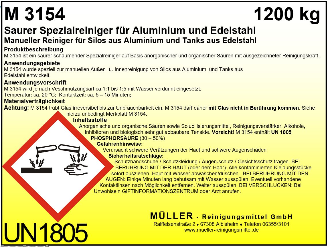 M 3154 ist ein flüssiger, saurer, schäumender, vielseitig verwendbarer Spezialreiniger auf Basis anorganischer und organischer Säuren. M 3154 enthält eine spezielle Kombination reinigungsaktiver Säuren, Solubilisierungsmittel, Reinigungsverstärker, Alkohole, Inhibitoren und kapillaraktiver, biologisch sehr gut abbaubarer Tenside.