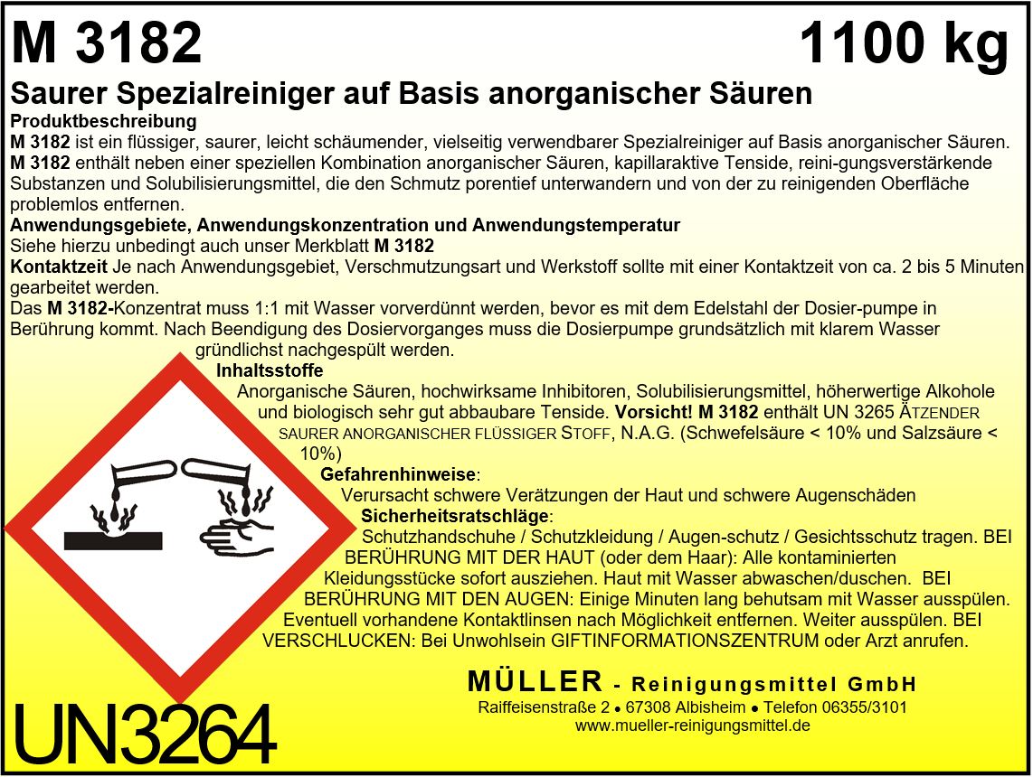 M 3182 ist ein flüssiger, saurer, vielseitig verwendbarer, leicht schäumender Spezialreiniger auf Basis anorganischer Säuren. M 3182 enthält neben einer speziellen Kombination verschiedener Säuren kapillaraktiver Tenside, reinigungsverstärkender Substanzen und Solubilisierungsmitteln, die den Schmutz porentief unterwandern und von der zu reinigenden Oberfläche problemlos entfernen. M 3182 enthält einen hohen Anteil hochwirksamer Inhibitoren, die den Säureangriff auf metallischen Oberflächen weitgehendst verhindern. M 3182 kann überall dort eingesetzt werden, wo neutrale und alkalische Reinigungsmittel versagen.