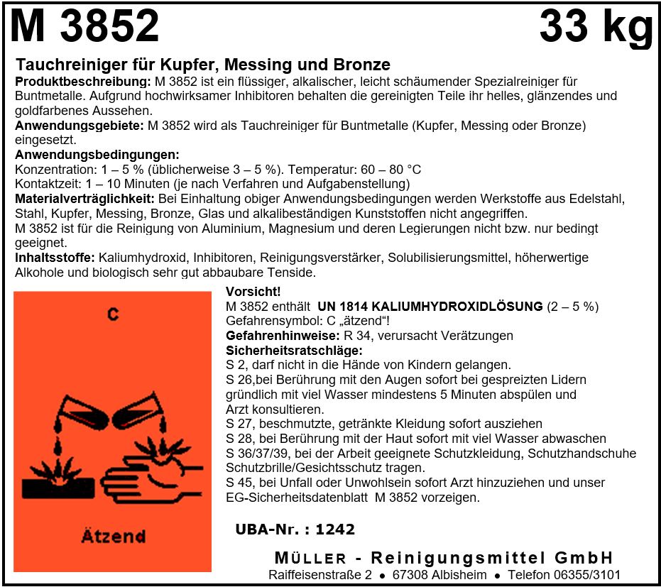 M 3810 ist ein flüssiger, alkalischer, leicht schäumender Tauch- und Ultraschallreiniger. M 3810 entwickelt bei hoher Materialschonung eine gute Reinigungskraft, da die einzelnen Bestandteile optimal aufeinander abgestimmt sind.