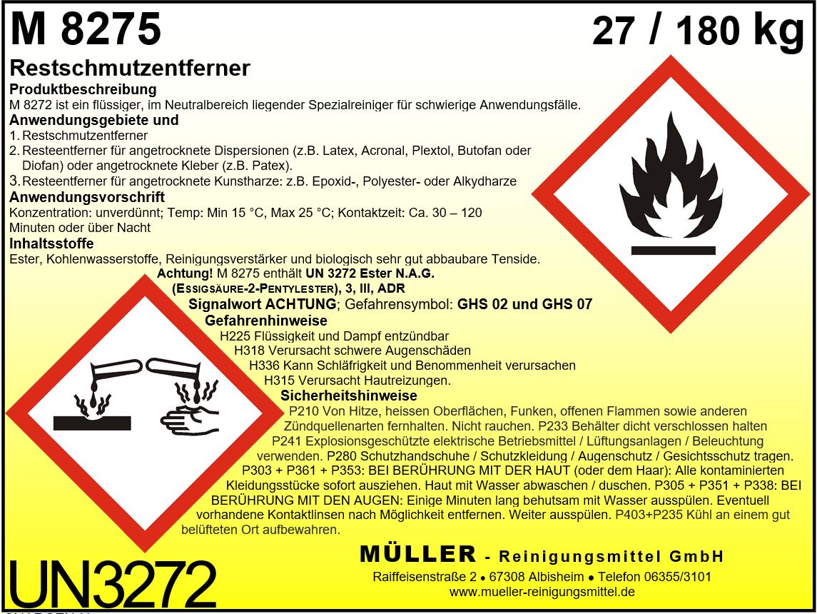 M 8275 ist ein hochwertiger, praktisch wasserfreier, flüssiger, im Neutralbereich liegender Spezialreiniger mit ausgezeichneter Reinigungskraft für bestimmte Anwendungsgebiete. M 8275 kann dort eingesetzt werden, wo herkömmliche Lösungsmittel (z.B. Aceton) die gestellten Reinigungsaufgaben nicht erfüllen.